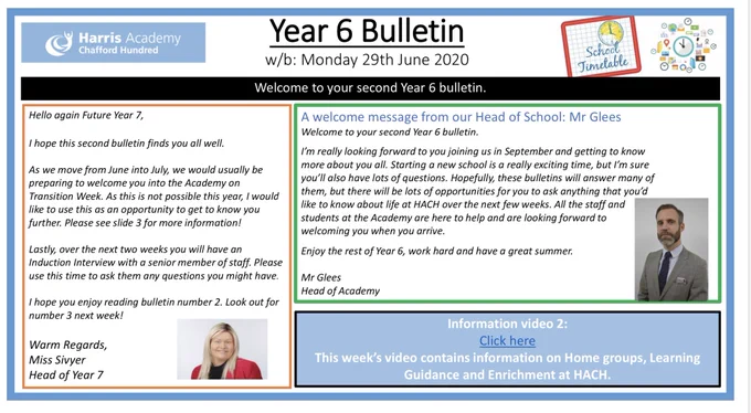 Our second Year 6 transition bulletin has been sent out. This week, hear from our Head of Academy; Mr Glees. Also read the top tips from Jack in Year 7. All Y6 Bulletins will also be available on our website. @TudorCourt_ @WarrenPrimary @HPACH2015 @HarrisFed pic.twitter.com/kKdcmhQwJT
